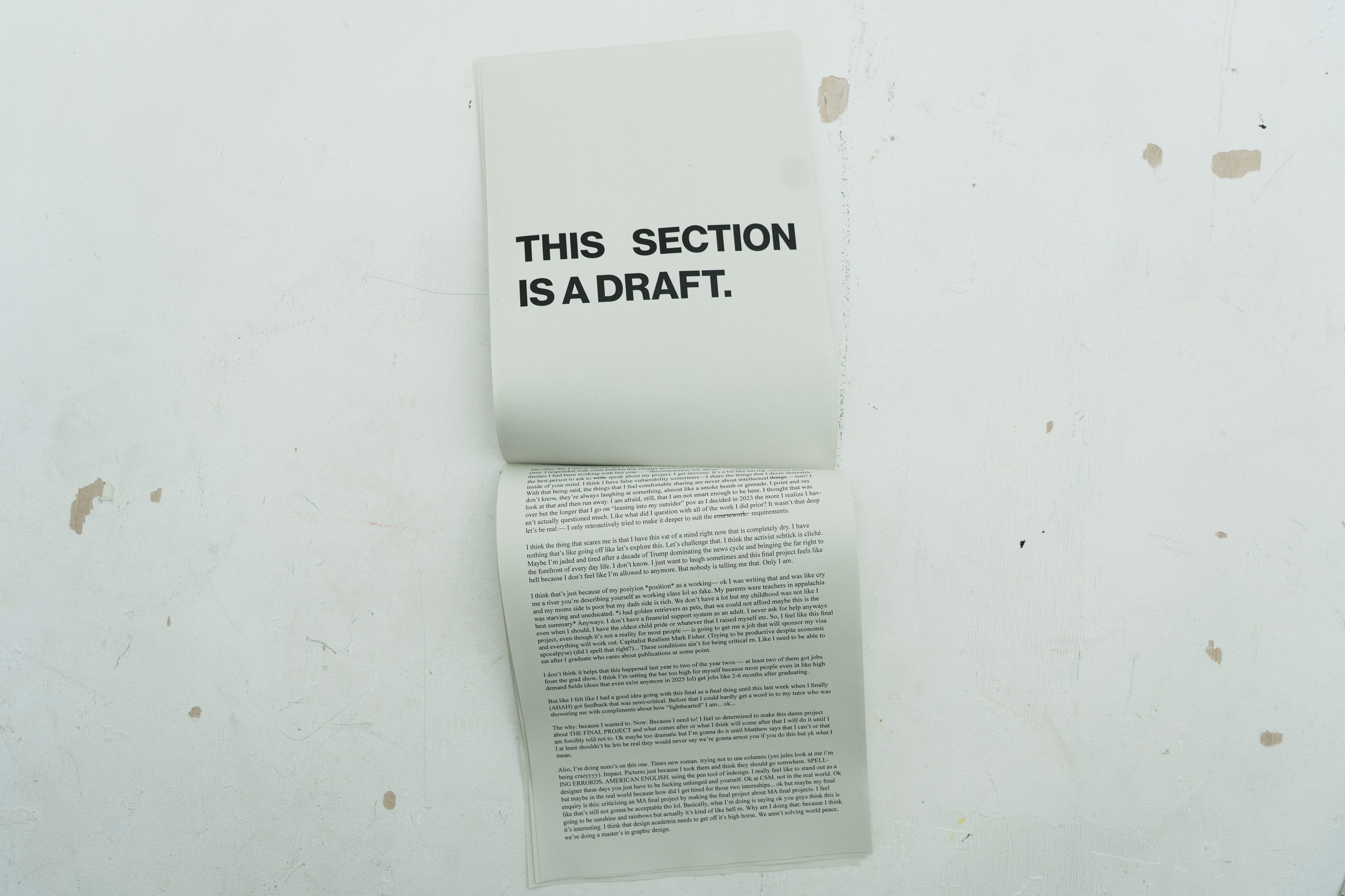 I just started dumping thoughts, angry, fearful, despondent into an indesign document and put photos contextualising why I might feel that way surrounding and underneath the text. I think it’s easy for the programme to assume that the student populace will go on continuing their research — there are lots of well off students and they are the majority, but some of us are self supported, and are unsure on how to apply what we’ve learned (and enjoyed learning) to the real world, and if the corporate, product first world will understand us and accept us.